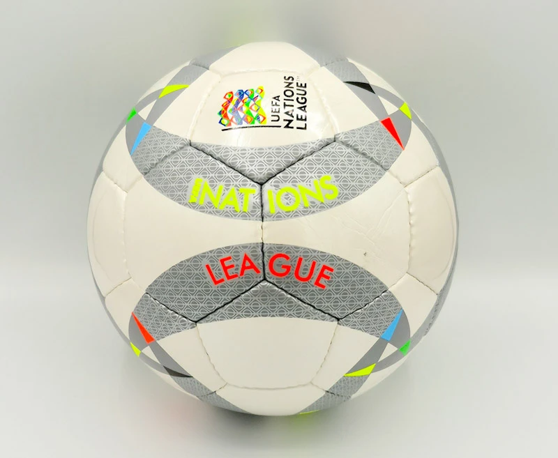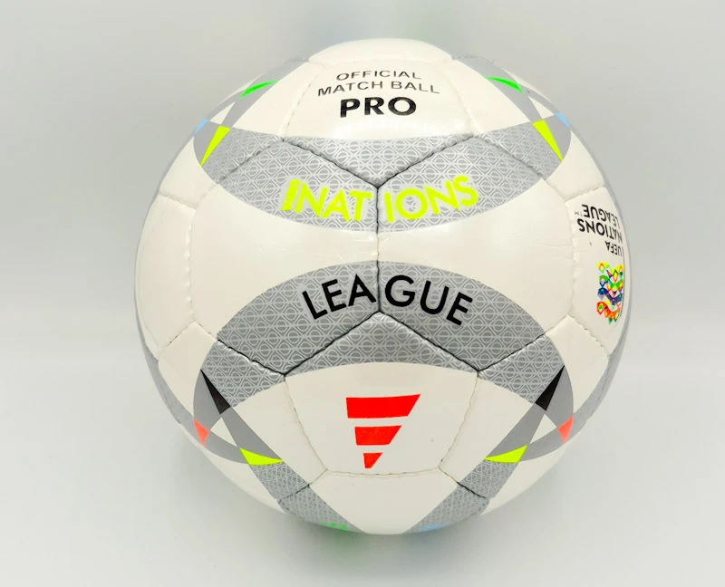 برخلاف بسیاری از توپهای شلوغ، این مدل از یک طراحی پایه سفید با پنلهای گرافیکی نقرهای و طوسی بهره میبرد که الگوی دایرهای ریز روی آنها چاپ شده است. رگههای رنگی نئونی (زرد، آبی و قرمز) در حاشیه طرحها، نمادی از پرچم کشورهای مختلف اروپایی است و جلوهای پویا به توپ بخشیده است. درج عبارت “Official Match Ball PRO” (طرح) و لوگوی رنگی لیگ ملتها، حس حرفهای بودن را به بازیکن منتقل میکند.