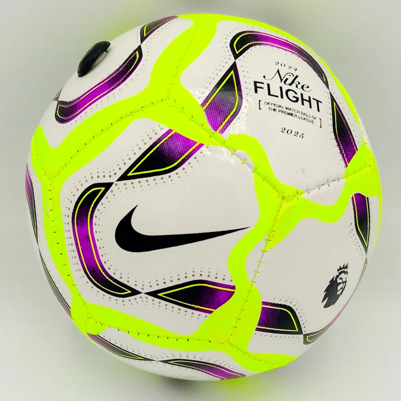این توپ کپی دقیقی از توپ رسمی فصل جاری لیگ جزیره است. زمینه سفید براق با گرافیک‌های جسورانه به رنگ‌های نئونی (زرد فسفری)، بنفش و مشکی تزئین شده است. لوگوی معروف شیر لیگ برتر (Premier League Lion) و نشان نایک (Swoosh) روی آن خودنمایی می‌کند. عبارت “Nike FLIGHT” و سال “2025” روی بدنه درج شده که نشان‌دهنده به‌روز بودن طرح است.