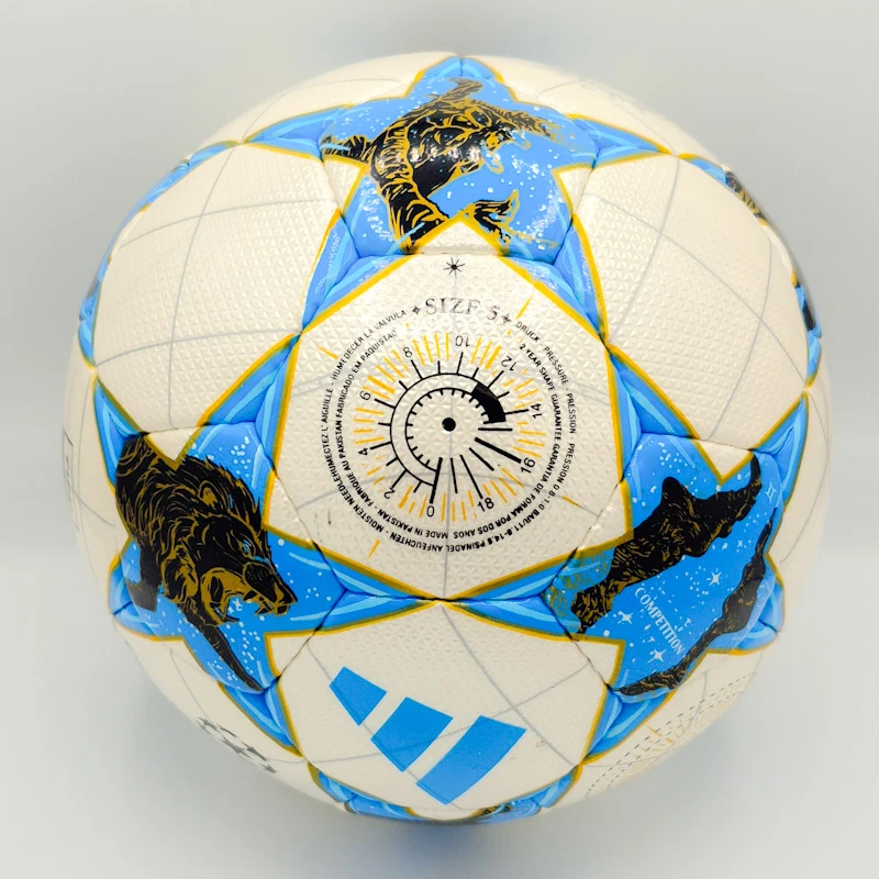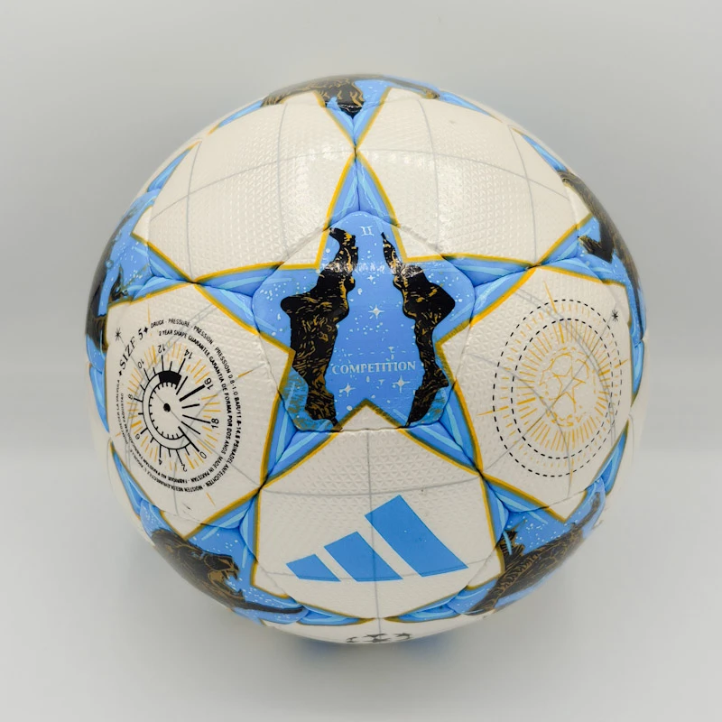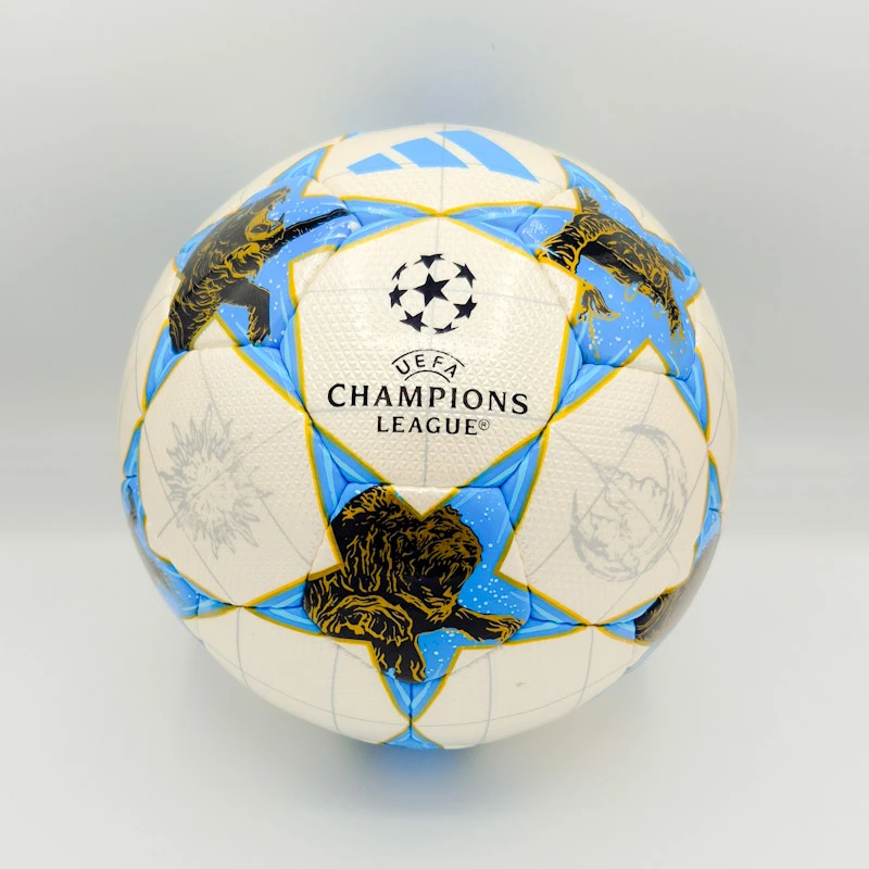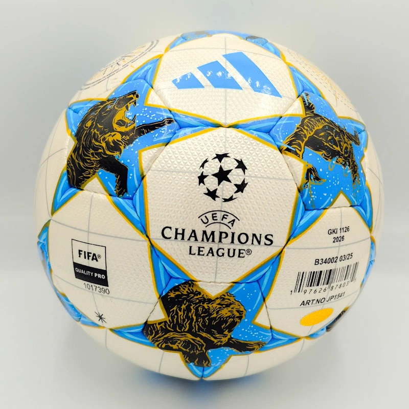 این مدل از طراحی نمادین “استاربال” (Starball) بهره می‌برد که در آن ستاره‌های آبی‌رنگ روی زمینه سفید قرار گرفته‌اند. نکته متمایز این طرح، گرافیک‌های بسیار زیبای شیر (Lion) در داخل ستاره‌هاست که نمادی از قدرت و شکوه است. وجود لوگوی رنگی Adidas و نشان رسمی Champions League به همراه استامپ FIFA Quality Pro (چاپی)، ظاهری کاملاً حرفه‌ای به توپ بخشیده است.